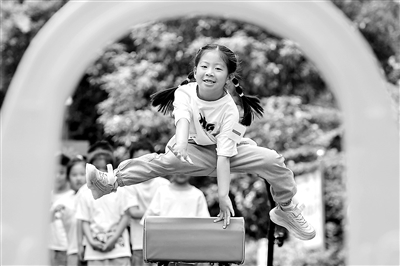 5月16日,浙江省湖州市長興縣張家村花園幼兒園幼兒參與“跳馬”項目。該園加強體教融合,通過田徑協會教練進校園、體適能跑操晨練等形式,讓幼兒在游戲中運動、在運動中成長。譚云俸 攝