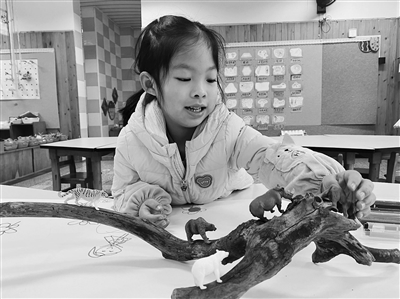 天佑說要帶著小動物去玩,她先設計好路線,試著把小動物都放到樹枝上。她一邊放一邊說:“好難呀,這個需要保持平衡。”整個過程天佑十分專注,用了整整6分鐘才把所有小動物都放上去。放完后,天佑在旁邊畫上了自己、鮮花和樹木,一邊畫,一邊講述著自己帶小動物去玩的故事。