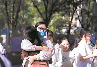 浙江省寧波市武嶺中學9名班主任身著印有“圓夢武嶺”字樣的紅衣送考,5名高三語文教師也在開考前來到考點,為考生加油鼓勁。高三(2)班的江可璐看到語文教師吳穎佳第一時間就興奮地跑上去擁抱:“吳老師能來送考,我真是太感動了!”