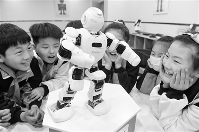 | ③安徽省阜陽市潁東區和諧路小學學生在科技興趣課堂上觀看機器人演唱歌曲和表演“功夫”。王彪 攝 |