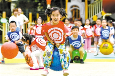 六月十五日,浙江省湖州市長興縣龍山幼兒園的孩子參與歡樂蹦跳趣味運動。當日是杭州亞運會倒計時一百天,該園舉辦“校園‘燃’起來 全面迎亞運”校園運動會,孩子們在快樂中期盼亞運會的到來。譚云俸 攝