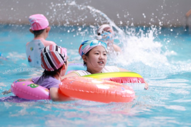 7月6日,孩子在河北省邢臺市內丘縣雪嵐全民健身中心戲水游玩。近期持續高溫天氣,當地孩子紛紛選擇水上娛樂活動消暑健身,樂享夏日清涼。劉繼東 攝