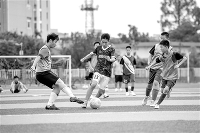 7月11日,在安徽省蕪湖市繁昌區田家炳中學的足球場上,恒冠少年足球隊小隊員在進行足球攻防和技能訓練。近年來,繁昌區高度重視校園足球運動,利用暑假組織青少年開展足球技能訓練、實戰對抗等活動,讓孩子們在訓練中體驗足球的樂趣、享受多彩暑假生活。肖本祥 攝