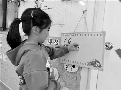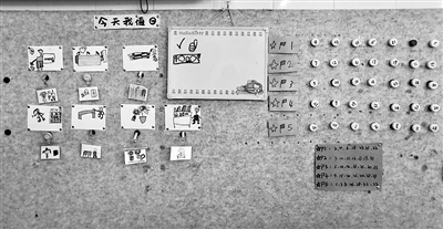 活動過程:我們把毛氈布固定在鐵皮墻上,幼兒可以自主選擇日期,用喜愛的方式表示“星期幾”,再將號碼畫在磁鐵帽上,讓其成為代表自己的個性磁鐵。磁鐵下方放置值日生安排表,若磁鐵擺放混亂,可以根據安排表調整位置,在此過程中,幼兒的比較、推理能力得到了鍛煉。“值日墻”的另一側,展示幼兒繪制的值日內容圖和工作牌。