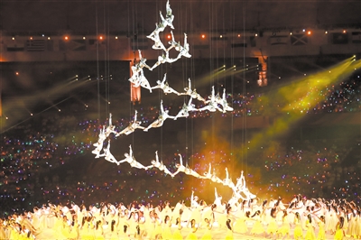在先民敲響石磬的打擊樂聲中,金色的陽光再次鋪滿體育場。開幕式文體表演開始。三星堆青銅重器璀璨,川劇變臉精彩亮相,數碼光線匯聚成“芯”,圓滾滾的大熊貓憨態可掬,藝術體操隊員們跳躍騰挪,巨大的芙蓉花瓣華麗綻放……15分鐘內,成都的歷史與現代交相輝映,人文與自然相得益彰,令全場觀眾目不暇接,歡呼不斷。