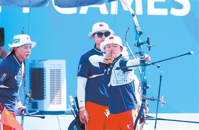 本報成都7月30日訊(記者 高毅哲)今天,中國射箭隊選手以231∶224戰勝法國隊,奪得男子復合弓團體冠軍,為中國射箭隊收獲了在成都大運會上的第一枚金牌。而在今天舉行的成都大運會射箭項目女子反曲弓團體決賽中,中國女子反曲弓隊在附加局以1環優勢爭得團體賽冠軍,為中國射箭隊再添一枚金牌。