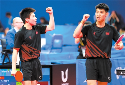 8月4日,獲勝后,徐瑛彬(左)、薛飛在慶祝。當(dāng)日,在成都舉行的第31屆世界大學(xué)生夏季運(yùn)動(dòng)會(huì)乒乓球男子雙打決賽中,中國(guó)組合薛飛、徐瑛彬獲得冠軍。