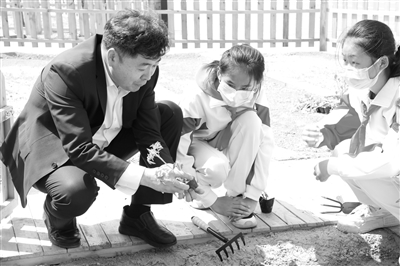 走出教學樓是學校預留的一塊校內農田——知真園,這里分季節種植著青椒、小麥、中草藥等作物,五年級的學生們正在教師的帶領下摘花生。王教凱和學生們一起參與,豆大的汗珠順著臉頰慢慢滑落。每逢這個時候,王教凱就化身為農田間一位親切的“大伯”,挽起袖子,質樸無華,一邊耕作,一邊和學生們交流。他拿起一顆飽滿的花生問學生:“你們說,這像什么數學符號?”“像數學符號‘無窮大’!”有學生搶答道。很快,一堂看似普通的語文課,被融入了數學學習。“是的,不僅兩個果仁的花生像‘無窮大’符號,隨著三個仁、四個仁的花生被生產了出來,我們國家的農作物產量也在不斷提高,這都離不開科學技術的發展,希望同學們用心學習,做一個有使命感的人,用科技強國,面向未來,改變世界!好不好?”“好!”學生們高舉起手中的花生藤,場面熱鬧非凡。你看,數學課又融入了為學生們扣好第一粒扣子的思政課,教育果然處處在發生。