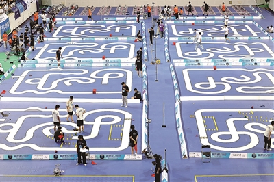 8月18日,大學生在參加智能汽車競賽。當日,第18屆全國大學生智能汽車競賽總決賽在天津工業大學開賽。競賽分為負壓電磁、專科電磁等10個競速組別,來自全國各高校504支隊伍的1500余名參賽隊員進入全國總決賽。本報記者 陳欣然 攝