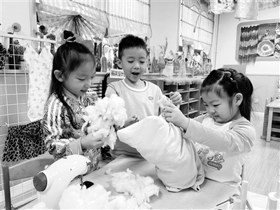 其次,保障游戲時間。幼兒需要充足的游戲時間,這是充分探索材料和實現(xiàn)深度學(xué)習(xí)的前提。我們調(diào)整了以往較為碎片化、緊湊的時間安排,保障幼兒每天上下午均有至少連續(xù)一個半小時的自主游戲時間;同時,我們還建立了彈性時間制度,如果個別幼兒在游戲時間結(jié)束時還在深度探索,教師則適當(dāng)延長時間,支持他們持續(xù)探究。