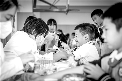 近日,在浙江省溫州市第二實驗小學,醫(yī)護人員給學生進行健康體檢。當天,浙江省溫州市鹿城區(qū)濱江街道黎明社區(qū)衛(wèi)生院組織醫(yī)護人員來到溫州市第二實驗小學,為該校學生提供“一站式”免費體檢服務。近年來,溫州市中小學校每年定期組織開展學生體檢工作,并為每位學生建立了健康檔案,及時準確掌握學生體質發(fā)展動態(tài)。 劉吉利 攝