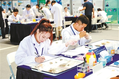 近日,中國研究生鄉村振興科技強農+創新大賽“集美杯”第三屆漁菁英挑戰賽決賽舉行,比賽由中國學位與研究生教育學會、中國科協青少年科技中心主辦,集美大學、大連海洋大學承辦。33家高校、科研院所的420多名研究生參加比賽。圖為在專業技能競賽環節,學生在辨別飼料原料。本報記者 熊杰 攝