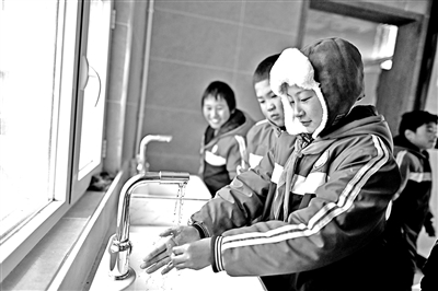 在青海省果洛藏族自治州瑪多縣花石峽鎮藏文中心寄宿制學校,五年級學生東桑(右一)在使用廁所后洗手,該學校是環境衛生特別項目學校之一(11月2日攝)。