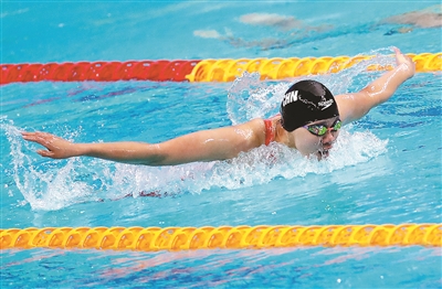 11月13日,第一屆學青會游泳(校園組)比賽在廣西南寧舉行。廣東隊俞李妍以2分08秒92獲得大學乙組女子200米蝶泳冠軍。圖為俞李妍在比賽中。本報記者 張學軍 攝