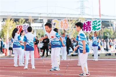 操場上,一條條繩子上下翻飛,交互繩平跳、高級繩中繩……這些讓人大呼“炫酷”的跳繩場景,是浙江省寧波市修人學校大課間的常態。這所地處寧波市江北區最北端的農村學校,多次在省市花式跳繩比賽中獲得佳績。這是江北區讓每所學校、每個學生都有出彩機會的生動體現。