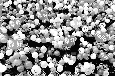 近日,山東省棗莊市光明路街道田莊小學學生手舉問候語、彩色氣球等表達祝福。為迎接“世界問候日”,該校開展多彩主題活動,學生們通過不同的方式傳遞溫情。 吉喆 耿德剛 攝