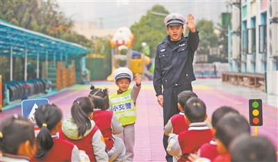 11月30日,貴州省貴陽市烏當區(qū)振新幼兒園的孩子們在交通警察的指導下學習交通指揮手勢。當天,烏當區(qū)交警大隊組織民警走進烏當區(qū)振新幼兒園,開展“交通安全記心間”主題教育活動,通過交通安全趣味游戲、交通手勢操示范等形式,提高孩子們的交通安全意識,迎接全國交通安全日的到來。袁福洪 攝