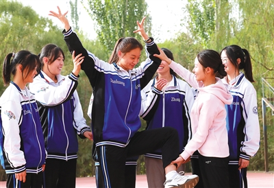 學生們身穿校服,隨著音樂翩翩起舞,舞姿輕盈優美,動作整齊劃一,不時擺出反彈琵琶、飛天等動作……敦煌中學根據敦煌壁畫中的飛天舞改編的課間操持續“走紅”網絡。該課間操融合了健美操的動作和敦煌壁畫中的舞姿,配上敦煌元素的音樂后,很受學生歡迎。