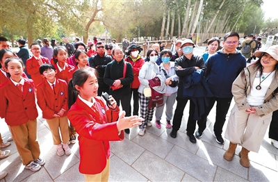 每逢節假日或周末,甘肅省敦煌市東街小學五年級(2)班學生李雨陽和小伙伴們都會如約來到敦煌莫高窟。他們用清脆悅耳的童聲講述敦煌文化,用童心傳承絲路精神,吸引著來自各地的游客。