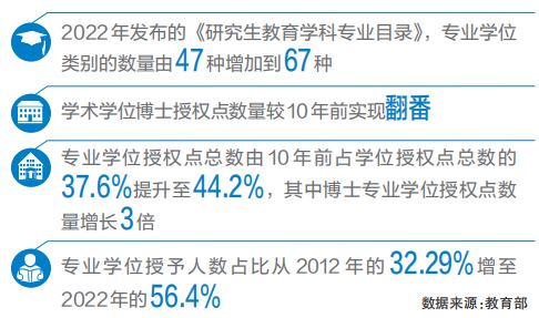學(xué)科專業(yè)設(shè)置體現(xiàn)了學(xué)術(shù)學(xué)位與專業(yè)學(xué)位的“并重”。2022年,教育部發(fā)布的《研究生教育學(xué)科專業(yè)目錄》,進(jìn)一步豐富了專業(yè)學(xué)位類別,專業(yè)學(xué)位類別的數(shù)量由原來的47種增加到67種,更充分、更精準(zhǔn)地對(duì)接經(jīng)濟(jì)社會(huì)需求,支撐行業(yè)產(chǎn)業(yè)高質(zhì)量發(fā)展。