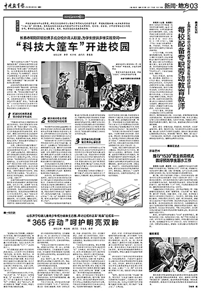 為此,地方新聞版今年推出“一地一館”系列報(bào)道,關(guān)注走出校門的學(xué)校教育,呈現(xiàn)各省份重點(diǎn)地區(qū)如何推動(dòng)中小學(xué)與當(dāng)?shù)夭┪镳^、美術(shù)館、音樂館、少年宮等場館進(jìn)行深度合作。學(xué)生走出校門,接受音樂、美術(shù)、書法等人文教育的熏陶。我們推出了《長春市朝陽區(qū):“科技大篷車”開進(jìn)校園》《濟(jì)南市槐蔭區(qū):以美為媒打造“成長全場域”》《廣東省廣州市越秀區(qū):“流動(dòng)博物館”來到學(xué)校門口》等系列報(bào)道,關(guān)注各地教育系統(tǒng)跨界整合教育資源,讓學(xué)生接受藝術(shù)熏陶。