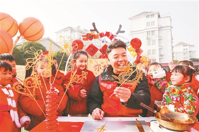 1月12日,在江蘇省如皋市城南街道新華社區(qū)新華幼兒園內(nèi),小朋友們?cè)谟^賞糖畫(huà)制作。當(dāng)日,江蘇省如皋市城南街道新時(shí)代文明實(shí)踐所、新華社區(qū)婦聯(lián)聯(lián)合新華幼兒園舉辦“傳統(tǒng)游園會(huì) 歡樂(lè)迎新春”活動(dòng),小朋友觀賞糖畫(huà)制作,學(xué)習(xí)做年糕,體驗(yàn)剪窗花,體驗(yàn)傳統(tǒng)民俗,喜迎新春佳節(jié)。徐慧 攝