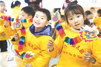 日前,江蘇省連云港市連云區(qū)墟溝街道南山社區(qū)與轄區(qū)八一幼兒園聯(lián)合開展“巧手做舞龍 傳承龍文化”主題活動。孩子們在志愿者引導下,用靈巧的小手,對材料進行拼接、粘貼,制作出一條條漂亮的拉花舞龍。圖為孩子們在展示自己的作品。通訊員 朱華南 攝