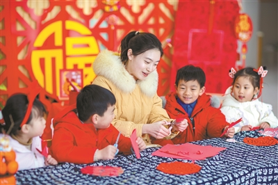 1月22日,在江蘇省興化市昭陽湖幼兒園,教師指導小朋友剪窗花。寒假臨近,該幼兒園開展豐富多彩的活動,孩子們在教師的指導下寫“福”字、剪窗花,體驗民俗,喜迎新春佳節。周社根 攝