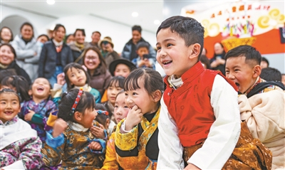 2月3日,孩子們在拉薩的兒童藏裝派對上觀看手偶表演。老師在派對上向孩子們講解藏歷新年的傳統(tǒng)習(xí)俗,活動豐富了孩子們的寒假生活。