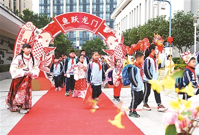 2月18日,舞龍表演隊在校門口迎接同學。當日,為迎接新學期開學,福州市晉安區實驗小學開展寓教于樂的“尋龍記”項目化學習活動,讓同學們在游戲中體驗傳統文化的魅力。新華社記者 林善傳 攝