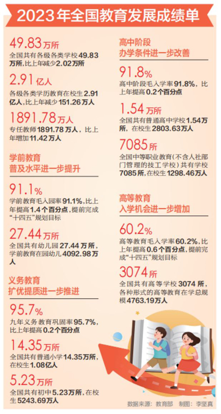 2023年,九年義務教育鞏固率95.7%,比上年提高0.2個百分點;高中階段毛入學率91.8%,比上年提高0.2個百分點;特殊教育學校數量比上年增長1.34%;學前教育毛入園率和高等教育毛入學率均提前完成“十四五”規劃目標,分別達到91.1%和60.2%。
