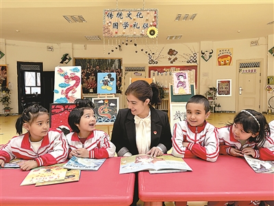 “在幼兒園里,我們特別注重民族團(tuán)結(jié)環(huán)境的創(chuàng)設(shè),讓中華優(yōu)秀傳統(tǒng)文化上墻,布滿校園,陪伴在孩子們身邊,融入孩子們的成長過程中。”艾米拉古麗·阿不都說。