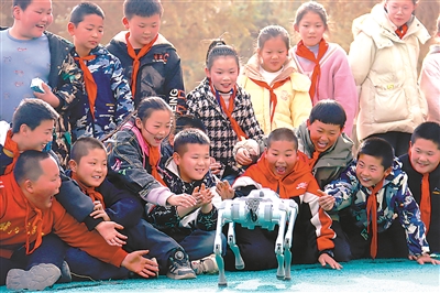 近日,甘肅省張掖市臨澤縣板橋鎮中心小學學生興奮地觀看機器狗表演。新學期伊始,該校邀請縣科協“科普大篷車”進校園開展科普教育活動,讓學生近距離感受科技魅力。沈貝 攝