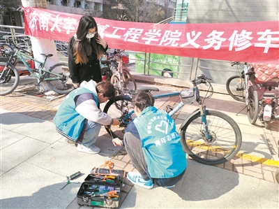 老教授口中的“小伙子”是濟南大學機械工程學院義務修車服務隊的一名隊員。修車隊創立于1991年,隊員們都是學院低年級的大學生,秉持“為同學服務,奉獻社會”的理念,以義務修車活動為主體,利用課余時間為校園師生及周邊社區居民提供免費的自行車和電動車維修服務,服務范圍涵蓋自行車和電動車的故障診斷、零部件更換、常規保養等方面,為校園師生和社區居民的出行提供便利。成立33年來,修車隊累計修車1.7萬余輛,志愿者服務時間超過1.05萬小時。