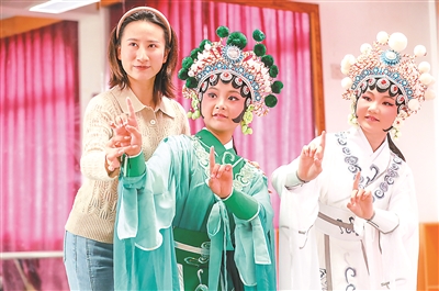 近日,在浙江省湖州市德清縣新安鎮勾里中心學校,戲曲教師在指導學生練習戲曲。近年來,該校積極開展“戲曲進校園”活動,聘請專業戲曲演員每周固定時間進校傳授,讓學生近距離感受戲曲文化的魅力,增進對傳統國粹的了解和傳承。王樹成 攝