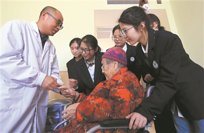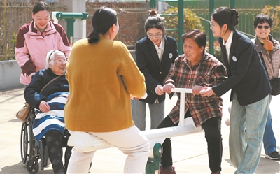 在徐州匯樂集養(yǎng)老服務(wù)有限公司琵琶社區(qū)養(yǎng)老服務(wù)中心,一群身穿校服的徐州幼專健康服務(wù)與管理學(xué)院學(xué)生正在見習(xí)。活動(dòng)室里,他們帶著老人一起開展音樂照護(hù)活動(dòng),熱情、耐心地引導(dǎo)老人跟著音樂做操、唱歌、律動(dòng),老人們的臉上洋溢著幸福、滿足的笑容。