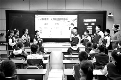 學(xué)校每學(xué)期舉行“雛鳳競(jìng)鳴”辯論大會(huì),通過(guò)層層選拔、晉級(jí),邀請(qǐng)專家、師生、家長(zhǎng)、社會(huì)人士擔(dān)任評(píng)委,網(wǎng)絡(luò)全程直播,促進(jìn)兒童提升思維和表達(dá)能力。