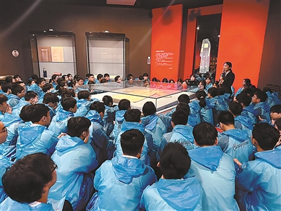 在跟隨學生觀展的1個多小時里,記者注意到,展館里隨處可見擺放整齊的小板凳,以供教師結合展品隨時開展思政教學——