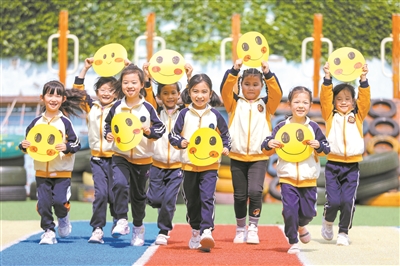 5月7日,在山東省青島市李滄區(qū)青峰路幼兒園,小朋友手持卡通笑臉快樂奔跑。當(dāng)日,該幼兒園開展“我微笑 我快樂”主題活動(dòng),孩子們通過手繪創(chuàng)意笑臉卡、比笑臉、擺放微笑造型等方式,培養(yǎng)健康樂觀心態(tài),迎接5月8日“世界微笑日”的到來。張鷹 攝