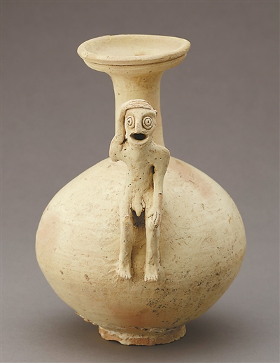 此次展覽第一單元展出了古代近東地區近50件從新石器時代到公元前后的陶器和釉陶制品。至少從新石器時代開始,古代近東地區的美索不達米亞、小亞細亞和埃及,彼此的宗教和文化就通過地中海東岸的黎凡特地區相互連通,彼此交匯,文化交流十分繁榮。數千年的歷史中,無數個民族和政權在此發展,從而形成多元交融的文明體系——他們發明圖畫、文字,建造大型神廟和體現王權的宮殿建筑,發展宗教和建立祭祀制度。約從公元前7000年開始,近東地區就出現了黏土燒制的陶器,除了常規器皿之外,更流行的是制作各種偶像和以動物形象變形的器物。本展中最早的一件古埃及陶器,是涅伽達文化一期(約公元前4000—前3500年)的黑頂陶器(圖1)。這是古埃及史前文化時期(又被稱為前王朝時期)最典型的一種陶瓷,常見于祭祀或隨葬品,以器身有紅色涂層、器口飾黑色涂層一周、表面拋光為特征,代表了古埃及當時最高的陶器制作技術。本展的明星文物之一,一件來自黎凡特地區(今敘利亞)的人物像注壺(圖2),壺嘴部位坐著人偶,右手放在頭上,似作拍腦袋恍然大悟狀,他滑稽的張開的大口,成為此件陶器的出水口,十分具有想象力。
