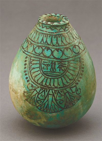 古代近東地區發明了最早的兩種類玻璃制品,即硅酸鹽人造制品施釉滑石和費昂斯,它們同樣是倚賴火的技術。約公元前3千紀中期,埃及或兩河流域產生了真正意義上的玻璃。而隨著二氧化硅、釉料和其他非金屬材質等合適材料的發現,以及達到必要溫度的燒制技術的提高,釉陶產生了,這與玻璃技術的演進幾乎是同步的。本展展出了多件古埃及和兩河流域的費昂斯制品,如常見的費昂斯制圣甲蟲形象,被用作護身符、禮儀印章,也用作葬儀禮器放在木乃伊的胸口和雙耳畔,代表古埃及神話中象征日出、重生和蛻變的凱布利神。古埃及崇尚產自古代阿富汗北部的青金石,所以還利用費昂斯模擬青金石的顏色,由此產生了“埃及藍”。公元前11世紀左右,中國的西周已經掌握了費昂斯制作技術,戰國時期,中國還發明了與“埃及藍”異質同構的人造材料“中國藍”,二者背后隱藏的東西文明交流密碼,已然成為當前學界的熱門話題。