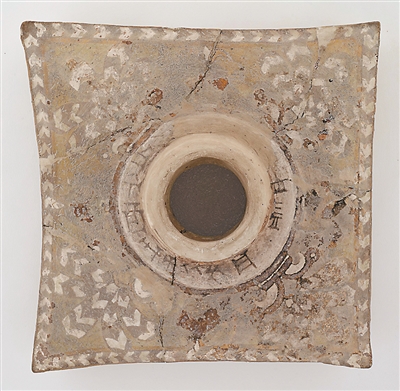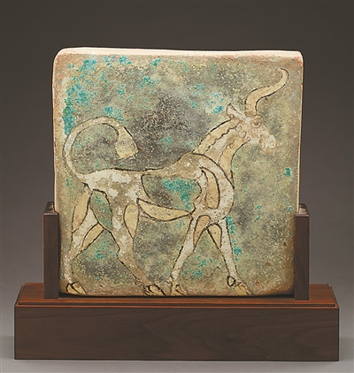 展覽中,多件費昂斯器皿以其華麗的色彩引人注目,如古埃及第19王朝(公元前1295—前1189年)的蓮紋瓶(圖3),造型優美,表面為不均勻的綠色,器面呈現出釉面的效果,瓶口至肩部繪三層各異的植物紋,內圈飾荷魯斯之眼和其他符號,下方裝飾著蓮花放射狀的花瓣和萼片——古埃及人認為蓮花象征著輪回與復活。又有多件文物展現了兩河流域新亞述時期費昂斯制品用途的廣泛性,并直接催生了釉陶在西亞的繁榮:費昂斯雙耳尖底瓶,以硬核成型法制成,工藝與當時的玻璃技術幾乎完全一致,頸部和肩部是平滑的弦紋,腹部是細密的波浪紋,整體豐富又多變,由于化學反應,器表出現綠色和褐色的釉質;費昂斯雙耳罐,器身為瓜棱狀,每條棱藍色和褐色交替,展現出當時的多色技藝;彩釉磚(圖4),淡綠色地,四角繪五葉植物,表面繪白色裝飾,穿孔周圍刻楔形文字“亞述國王圖庫爾提·尼努爾塔的兒子”,可知這是一塊與新亞述帝國國王亞述巴尼拔二世相關的制品,當用來裝飾于富麗堂皇的亞述王宮。