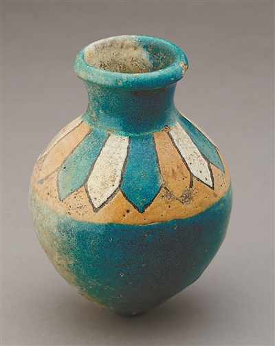 嚴格意義上來說,古代伊朗高原與古代近東是一體的。由于伊朗高原及胡齊斯坦平原與美索不達米亞天然的毗鄰關系,因此關于古代伊朗的歷史研究,大多情況下都無法從彼此緊密的關系中剝離開來,文化的對抗與交融又是二者互相交流的主要形式。在陶器制作上,無論是器形還是紋飾,伊朗高原似乎與周邊地帶保持著互動,如歷史悠久的彩陶,器形與紋飾可與同時期近東、中國出土的彩陶進行比較;各種造型古樸夸張、獨具匠心的人形或動物形陶器以及長流器等,在亞洲中西部地區和中國皆十分流行。釉陶技術在伊朗的青銅時代末期已經得到運用,已知釉磚的最早證據,發現于古代伊朗中埃蘭時期公元前13世紀建造的喬加贊比爾塔廟上。本展即展示了多件公元前1千紀的釉磚,將植物、幾何、動物、人類和神話人物的圖像相結合:其中一件公牛紋彩釉磚,深藍和淺藍色釉料自然融合形成底色,以黑色勾勒行走中的公牛的形態和肌肉,再以黃色和白色為公牛上色,十分精美(圖5);另一件鳥身神人紋彩釉磚,以深藍色和淺綠色為底,以黑色勾勒人物形象,人面為側面,頭上的角向后彎曲,有人類的胳膊和雙腿,還有舒展的羽翼和鳥尾,錯落有致地涂上白色、黃色和藍色釉料,異彩紛呈。本單元最吸引觀眾的,是一件彩釉尖底瓶,周身涂藍色釉,瓶肩涂黃色飾帶,其上裝飾白色、黃色和藍色花瓣,代表了公元前1000年最先進的上釉技術(圖6)。