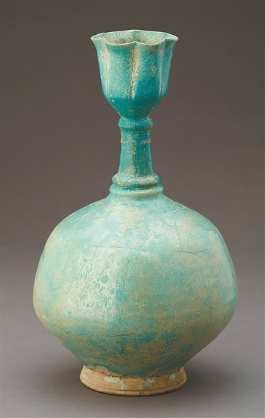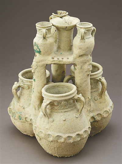 彩釉工藝成為伊朗制陶的一個傳統,并在帕提亞時期達到高度成熟,例如本展的展品:青綠釉雙耳壺,瓶口與把手類似希臘式雙耳瓶,瓶身為球形,瓶腹上半部分飾乳釘紋,是模仿有模吹制玻璃器的效果;青白釉雙耳扁壺,圓形器身,器口、頸部和小耳的上部施青釉,其余為白釉,造型優美,色彩美不勝收;尤其值得一提的是青釉多連壺,與中國漢代出現的連體壺有異曲同工之妙,器身青綠釉已銀化,極有巧思(圖7)。