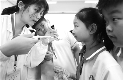 5月17日,濟(jì)寧職業(yè)技術(shù)學(xué)院大學(xué)生志愿者在講解鏡片是如何加工成眼鏡的。當(dāng)天,該校近視防控宣講團(tuán)聯(lián)合濟(jì)寧市教育局舉辦近視防控科普宣傳大篷車進(jìn)校園活動(dòng),走進(jìn)濟(jì)寧學(xué)院附屬小學(xué)冠亞校區(qū)。該近視防控宣講團(tuán)主要提供公益性的電腦驗(yàn)光、視力檢查、生物測(cè)量等檢查項(xiàng)目,并向孩子們普及保護(hù)視力的科學(xué)知識(shí)。