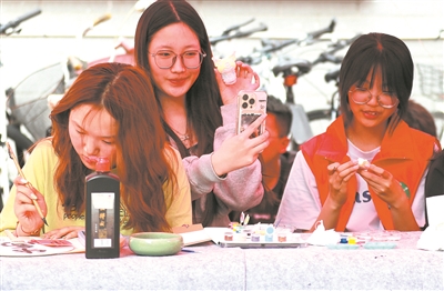 為讓社區文化生活錦上添花,求知書院美術學、環境藝術設計專業學生開展了校園寫生、色彩涂鴉、書法篆刻活動。工業設計專業碩士研究生李直澄創作了“萬物共悅”主題的井蓋涂鴉作品,她說:“我很享受這種藝術表達方式,感覺我們的生活環境更有溫度了。”