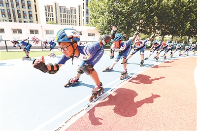6月12日,河北省唐山市豐潤區(qū)迎賓路小學(xué)學(xué)生在進(jìn)行輪滑訓(xùn)練。近年來,豐潤區(qū)廣泛開展陽光體育運(yùn)動(dòng),將輪滑、舞龍等納入學(xué)校體育課程,讓學(xué)生在豐富多彩的體育活動(dòng)中鍛煉身體,快樂成長。朱大勇 攝