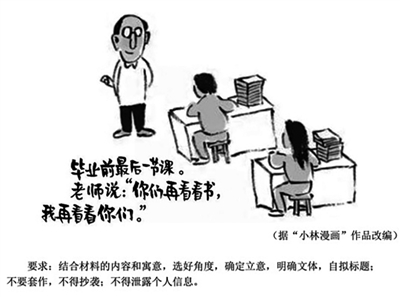 不少人認為這幅漫畫的核心題旨是頌揚師生情。如若此判斷成立,那么用這樣的一幅漫畫頌揚師生情,似乎并不典型。教師為救護學生,舍生忘己,獻出生命;教師為幫扶學生,帶入自己家中,視為己出,一心養育:這樣的師生情似乎比題目所傳達的更為深摯感人。小林漫畫的原作,老師說的話是,“你們再看看卷子,我再看看你們?!泵}者將原作中的“卷子”換作了“書”。從某種狀況上說:“你們再看看卷子”的表述,是更符合國情的,這亦是希望準確捕捉民眾心態的小林老師所追求的。但命題者更希望,用“看看書”來呈現教育的核心追求與內在期待。因此,借教師之口傳達而出。