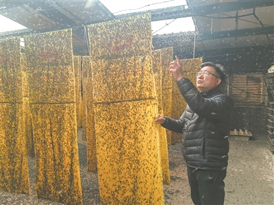 在成蟲繁殖間里,萬“虻”飛舞,楊森一邊詢問工作人員繁殖間的溫度和濕度情況,一邊熟練地拉開箱屜,察看產卵情況,并提醒記者小心別踩到落在地上的蟲子。