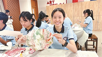 幾滴彩色大漆水面輕點(diǎn)、徐徐暈開,一張剪成花窗樣式的白紙以或直或曲的線條自在入水……再提起時(shí),已是一幅獨(dú)一無(wú)二的漂漆小作。這是包潤(rùn)熙和美術(shù)老師張存惠的跨學(xué)科社團(tuán)主題課堂。她們把園林花窗和非遺大漆結(jié)合,帶領(lǐng)學(xué)生賞花窗、識(shí)大漆,并自己動(dòng)手漂制獨(dú)具蘇州園林韻味的藝術(shù)小品。教室一角,還陳列著學(xué)生親手制作的掐絲琺瑯、竹刻等作品。